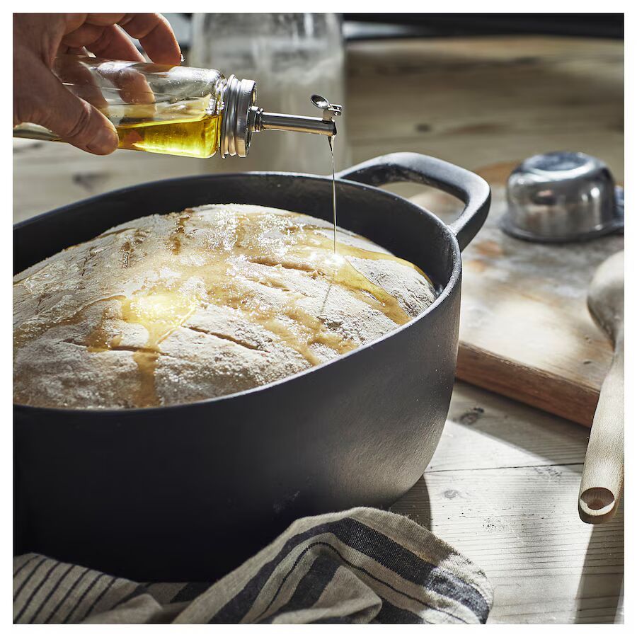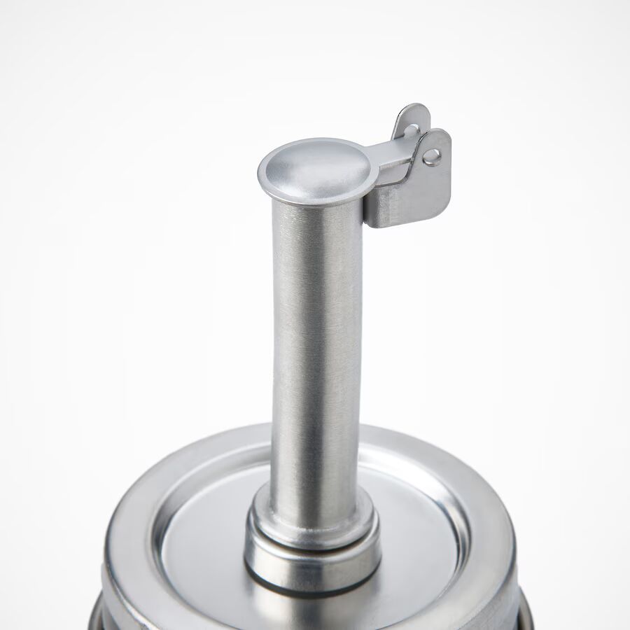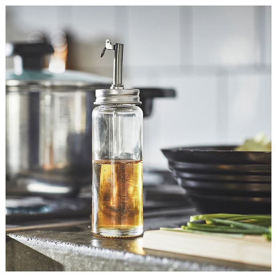 A sleek, transparent oil and vinegar bottle with a stainless steel lid, designed for convenient pouring and freshness.