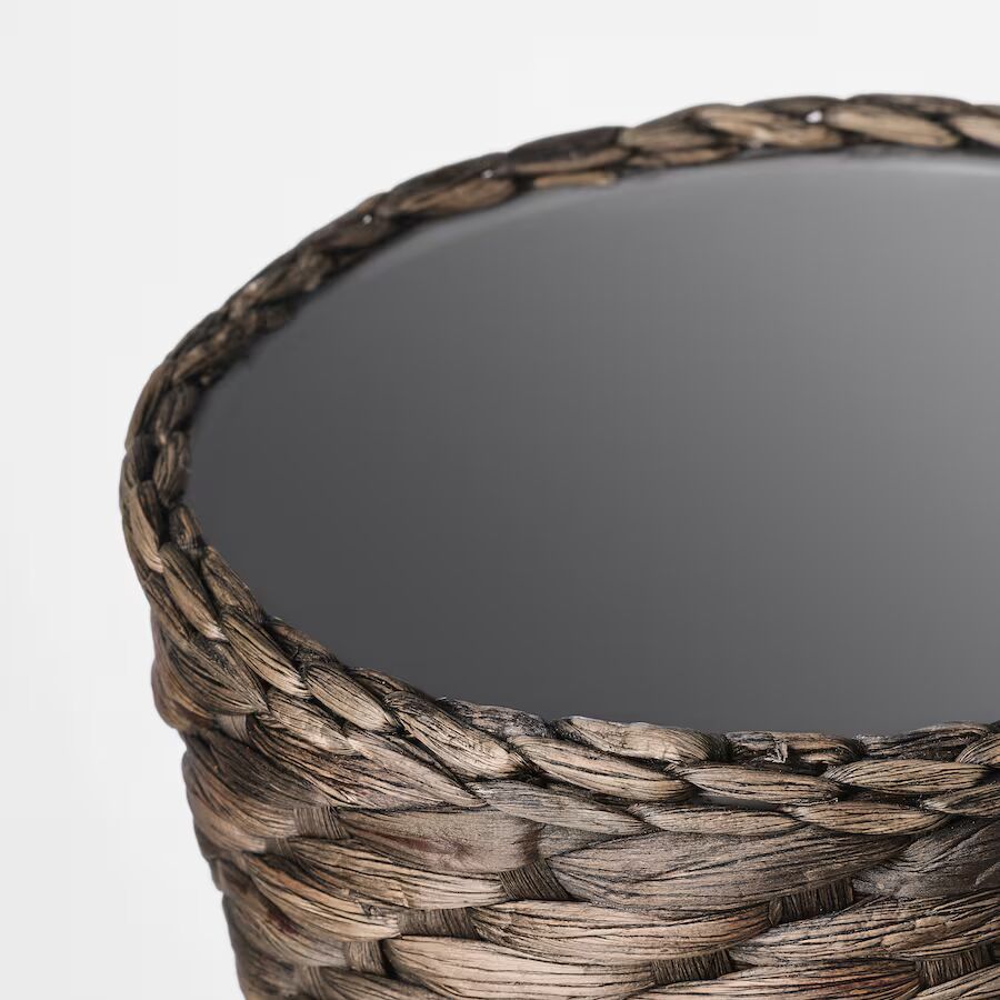 Handwoven water hyacinth plant pot with a warm, natural look. Features a plastic inner pot for waterproofing. A sustainable and stylish choice for indoor spaces.