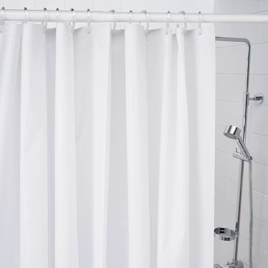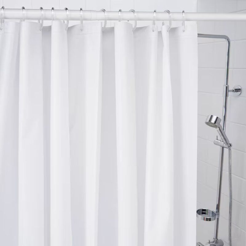 A clean and fresh white shower curtain with a water-resistant surface that repels water effectively. Easy to cut to size, ensuring a perfect fit for any shower space.