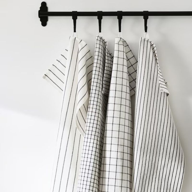 A set of 4 cotton tea towels with playful patterns featuring squares, dots, and kitchen utensils. Yarn-dyed for long-lasting colors and includes hanging loops for easy storage