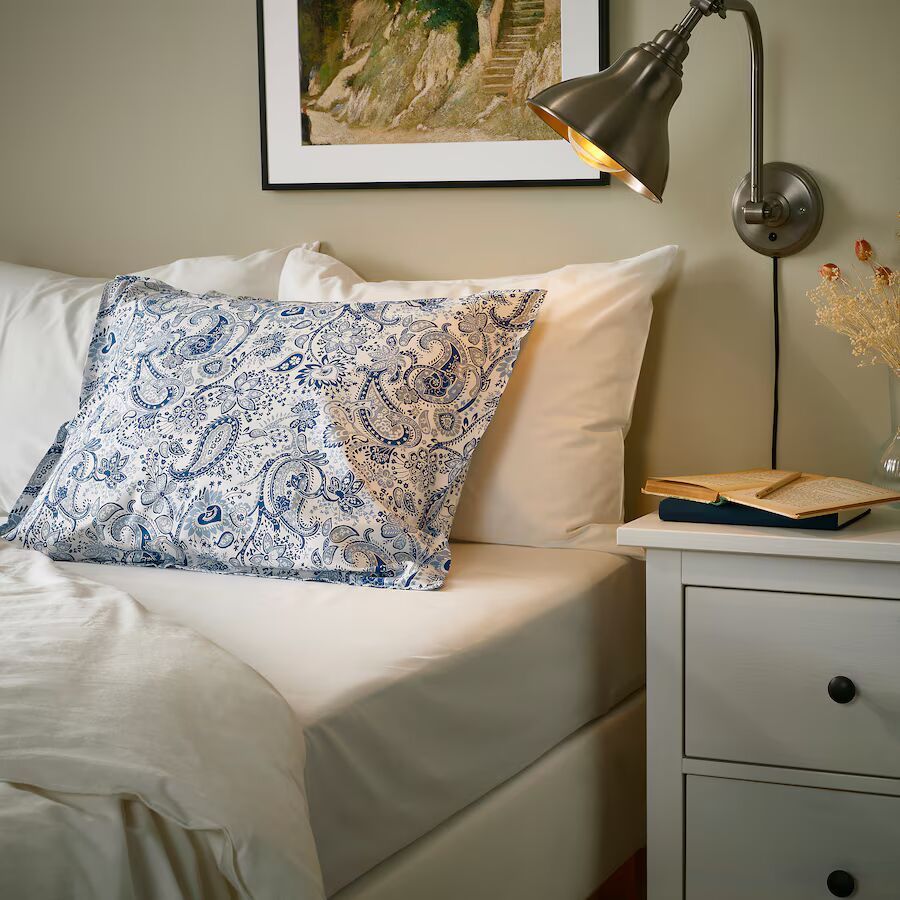 A stylish pillowcase with a timeless paisley pattern in fresh, contrasting colors. Made from a breathable cotton-viscose blend with a fine sheen for a soft, cool, and smooth feel. Features an envelope closure for a neat and secure fit.